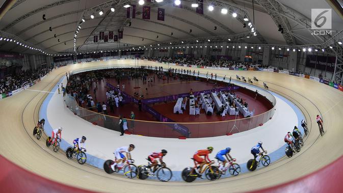 Pesepeda beradu cepat dalam laga balap sepeda Omnium Putra nomor Individual Pursuit 4.000 meter di Jakarta Internasional Velodrome, Kamis (30/8). Pesepeda Indonesia Nandra Eko Wayudi berhasil mencapai peringkat enam. (Merdeka.com/Imam Buchori)