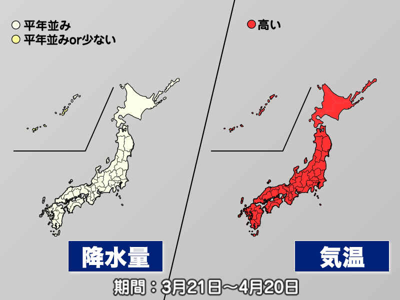 4月も平均的には気温の高い傾向は続くものの、寒暖の差が大きくなる見込みです。一時的に寒気が南下して、気温の下がることがありますので、寒暖差に備えた体調管理が必要になります。