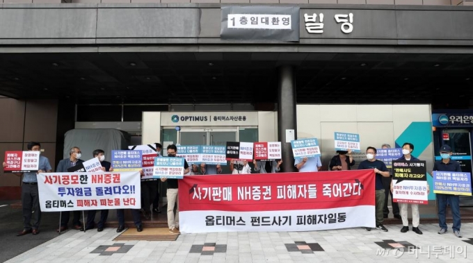 | 15일 서울 강남구 옵티머스자산운용 사무실 앞에서 옵티머스 사모펀드 피해자들이 투자원금 회수를 호소하며 피켓을 들고 있다. /사진=이기범 기자 |