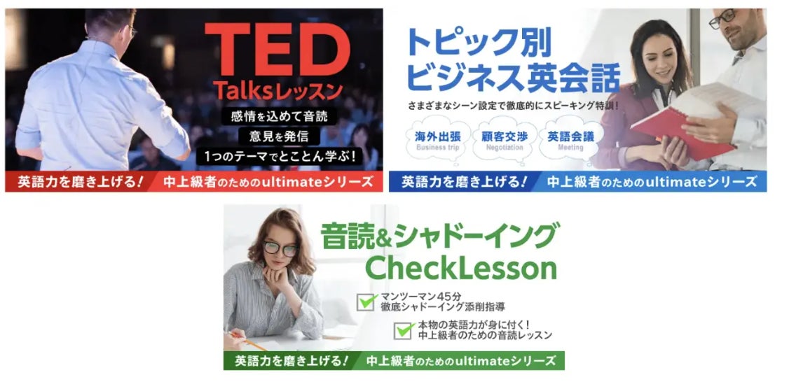 新たに中上級向けの3コースがラインナップ。英語学習者に大人気のTED Talksを使って、音読特訓からディスカッション、プレゼン練習をとことん行うTED Talksレッスン、顧客交渉や英語会議などリアルなシーン設定で状況説明やディスカッション課題を行うビジネスシーン別英会話コースなど、中上級者向けのレッスンが充実しました。初めてのビジネス英会話からより実践的な英会話まで、あなたのレベルに合わせて英語を学ぶことができます。どのコースからスタートすべきか、無料カウンセリングでスタッフがご案内しますので、まずはカウンセリングにご予約ください。